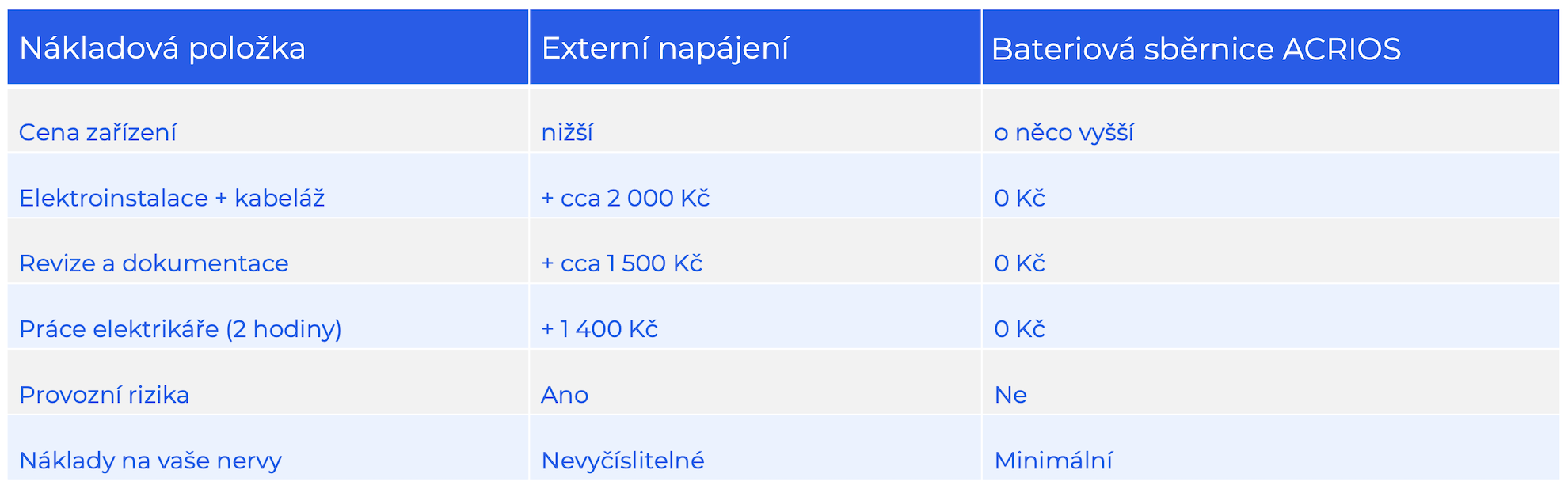 Srovnání nákladů: Externě napájená sběrnice vs. sběrnice ACRIOS napájená z baterie